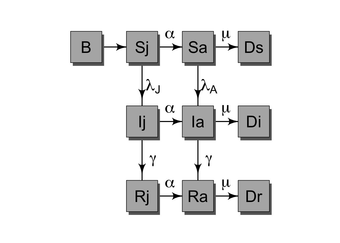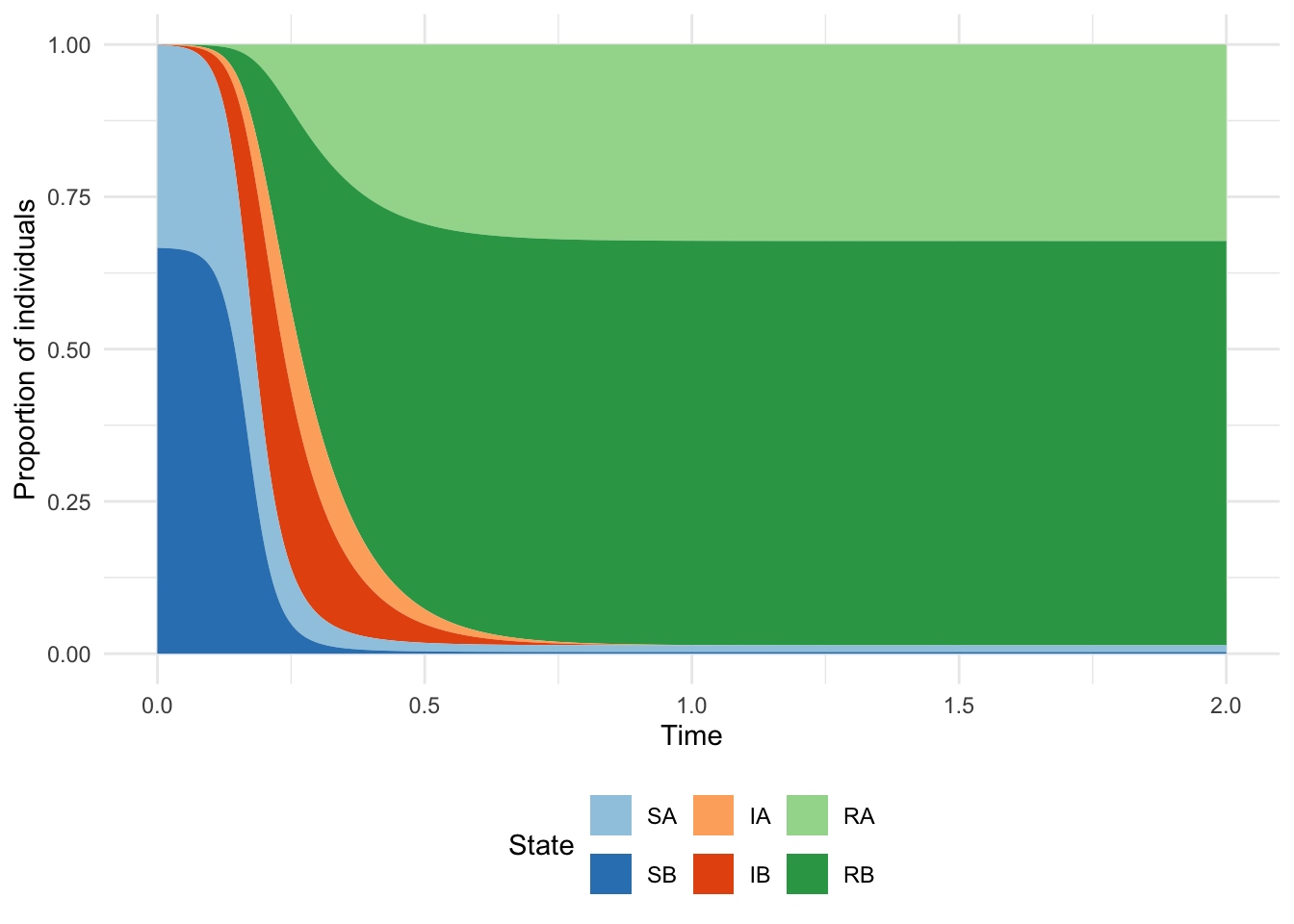 Which can be written in equations as, \[ \begin{aligned} \frac{\dd{S_a}}{\dd{t}} &= -\lambda_a\,S_a \phantom{-\gamma\,I_b}\\ \frac{\dd{S_b}}{\dd{t}} &= -\lambda_b\,S_b \phantom{-\gamma\,I_b}\\ \frac{\dd{I_a}}{\dd{t}} &= \phantom{-}\lambda_a\,S_a -\gamma\,I_a\\ \frac{\dd{I_b}}{\dd{t}} &= \phantom{-}\lambda_b\,S_b-\gamma\,I_b\\ \frac{\dd{R_a}}{\dd{t}} &= \phantom{-\lambda_a\,S_b}+\gamma\,I_a\\ \frac{\dd{R_b}}{\dd{t}} &= \phantom{-\lambda_a\,S_b}+\gamma\,I_b\\ \end{aligned} \]