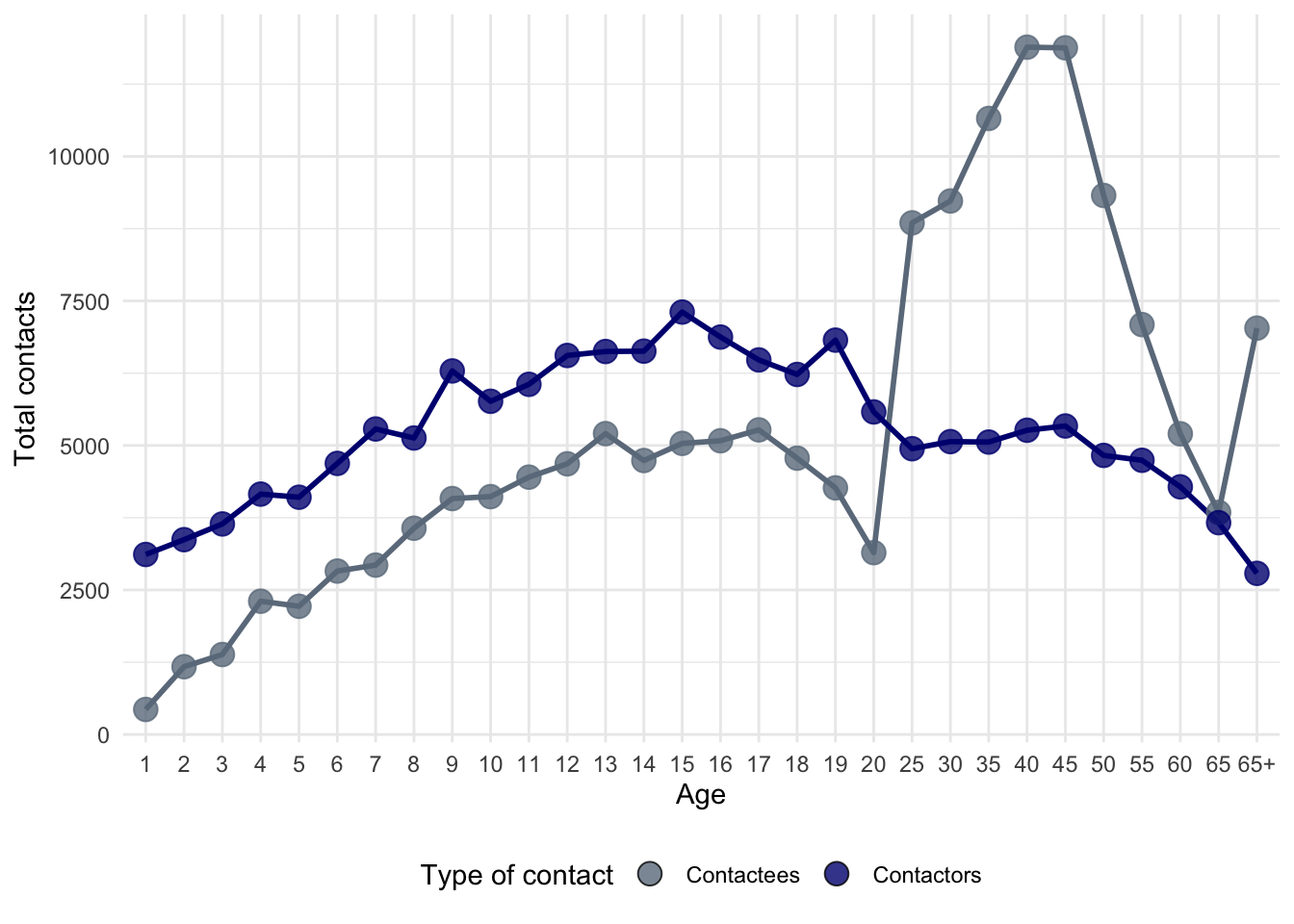 The POLYMOD study (Mossong et al. 2008) was a journal-based look into the contact network in contemporary European society. Let’s have a look what these data tell us about the contact structure.